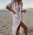 تقدم هذه الفستان القميص الأنيق شقوقًا عالية وتفاصيل مزررة، مما يوفر شكلًا عصريًا. مثالي لمناسبات متنوعة، يجمع بين الأناقة والراحة.