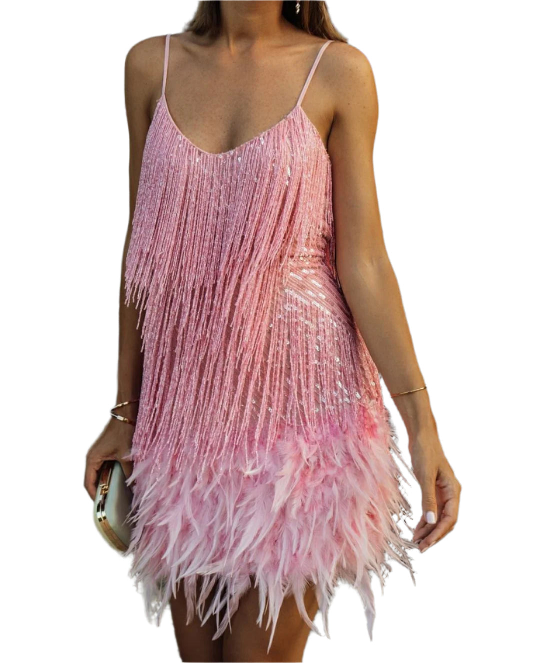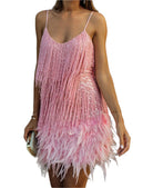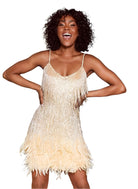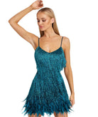 هذه الفستان القصير مزين بالأهداب والريش للحصول على تأثير أنيق. قصته الضيقة تبرز القوام. مثالي للمناسبات الخاصة والسهرات.