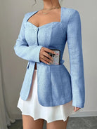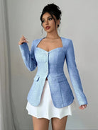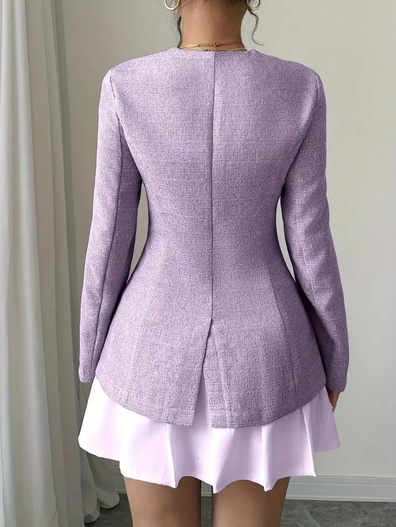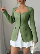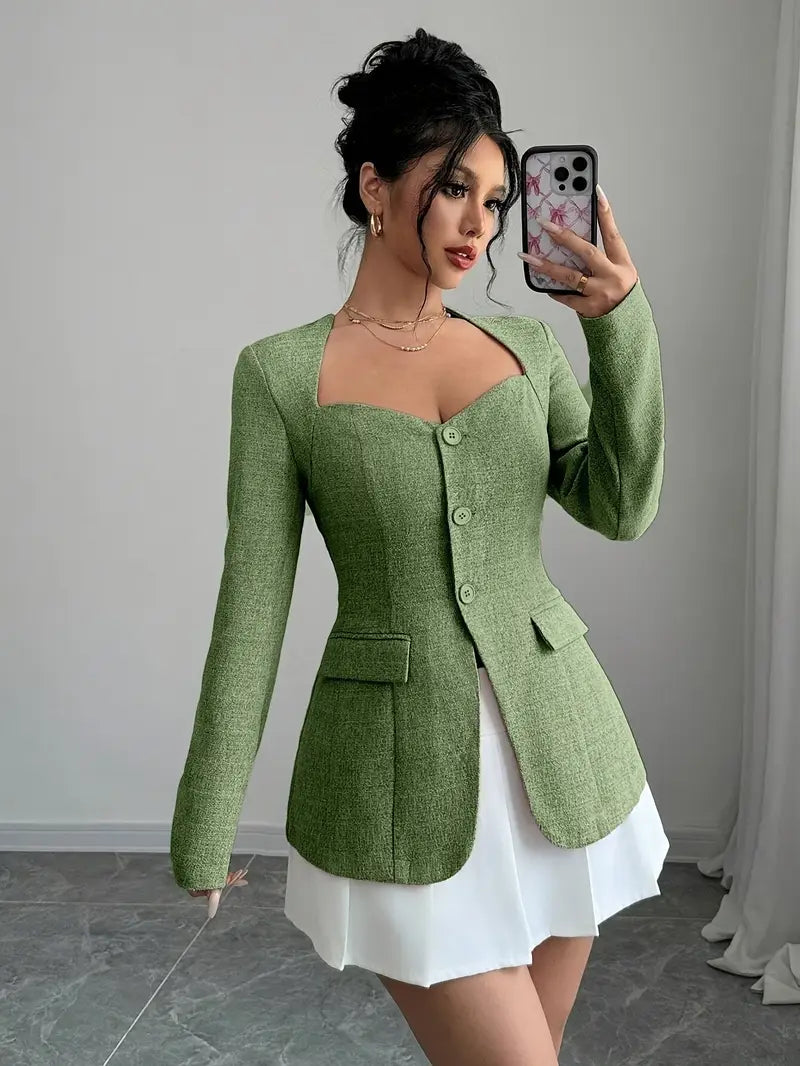 このボタン付きジャケットは、タイトなカットとモダンなスクエアネックでシルエットを引き立てます。エレガントで女性らしい印象を与え、オフィスでも外出時でも着用できます。丁寧なデザインと繊細なボタンが、あなたの装いに時を超えた洗練さを加えます。