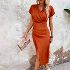 Tento midi šaty nabízejí lichotivý střih s výstřihem do V a krátkými rukávy. Jejich teplý odstín a jemný rozparek dodávají nádech sofistikovanosti.
