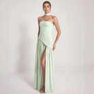 Dieses lange Kleid betont die Silhouette dank seines strukturierten, trägerlosen Mieders. Der seitliche Schlitz verleiht einen Hauch von Weiblichkeit und Selbstbewusstsein. Ideal für elegante Abende, vereint es Charme und Komfort.