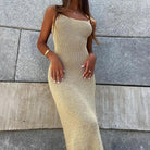 Αυτή η μακριά φόρεμα αναδεικνύει τη σιλουέτα με μια φυσική και εκλεπτυσμένη ροή. Ο μινιμαλιστικός σχεδιασμός του ταιριάζει εξίσου σε μια καθημερινή εμφάνιση όσο και σε μια κομψή βραδινή έξοδο. Οι λεπτές τιράντες και το τετράγωνο ντεκολτέ του προσδίδουν μια διακριτική αίσθηση.