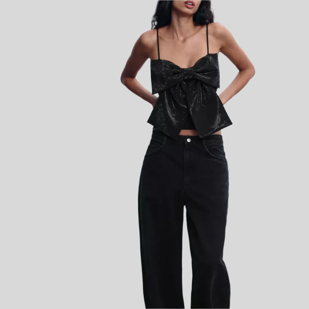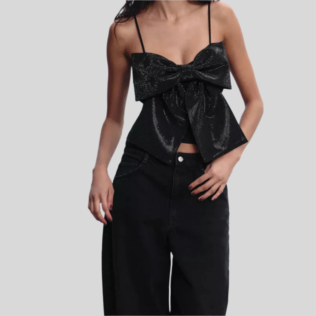 Αυτό το κομψό τοπ διαθέτει μια λαμπερή σχεδίαση που αναδεικνύεται από έναν χαρακτηριστικό κόμπο. Ιδανικό για ειδικές περιστάσεις ή για να προσθέσετε μια κομψή αίσθηση στην καθημερινή σας εμφάνιση. Διαθέσιμο σε πολλές μεγέθη για να ταιριάζει σε όλους τους σωματότυπους.