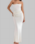 Αυτό το μακρύ φόρεμα χωρίς τιράντες αναδεικνύει τη σιλουέτα με μια εμφάνιση ταυτόχρονα κομψή και εκλεπτυσμένη. Ο δομημένος κορσές τονίζει απαλά τη μέση, ενώ η ρέουσα φούστα συνοδεύει τις κινήσεις σας με χάρη. Μια ιδανική επιλογή για επίσημες βραδιές, δεξιώσεις ή επίσημες εκδηλώσεις.