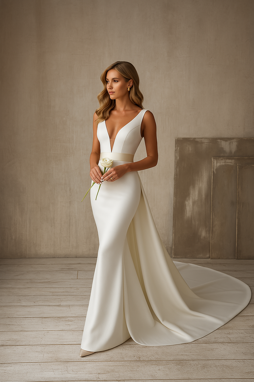 Αυτή η μακριά νυφική φόρεμα διαθέτει βαθύ ντεκολτέ σε σχήμα V και χωρίς μανίκια. Η κομψή ουρά προσθέτει μια μεγαλοπρεπή πινελιά στην εμφάνισή σας.