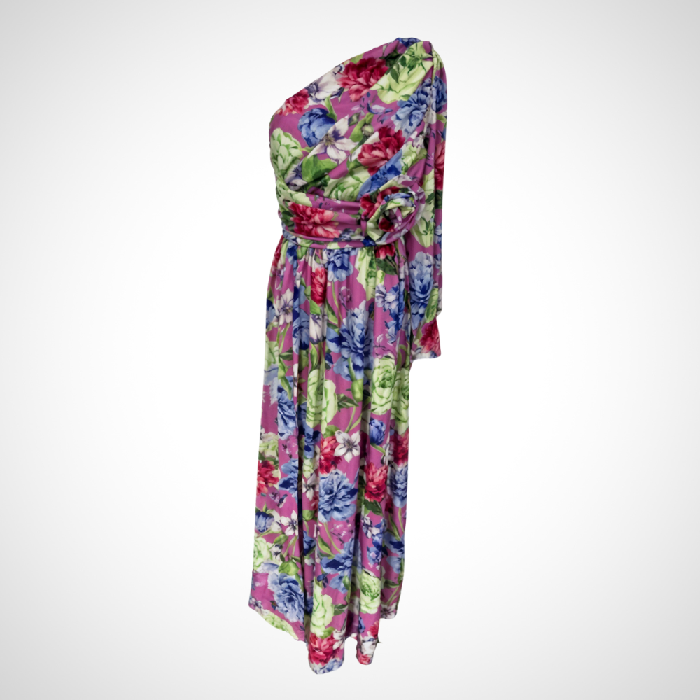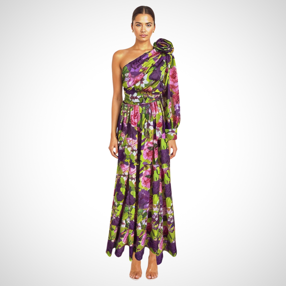 Αυτό το μακρύ ασύμμετρο φόρεμα αποκαλύπτει τον ώμο με διακριτικότητα και κομψότητα. Το ρευστό του στρίφωμα και το ελαφρύ ύφασμα εξασφαλίζουν ιδανική άνεση, ακόμη και σε ζεστό καιρό. Τέλειο για μια κομψή και τολμηρή εμφάνιση το καλοκαίρι.