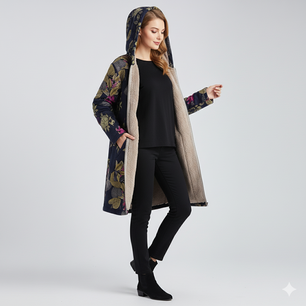 Tämä hupullinen talvitakki kietoo kehon pehmeään ja mukavaan lämpöön. Sen pörröinen vuori suojaa tehokkaasti kylmältä samalla kun se tarjoaa hyvinvointia jokaiseen liikkeeseen. Elegantit kukkakuviot tuovat naisellista ja luonnollista tyyliä talvipäiviisi.