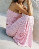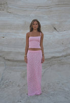 Tämä naisellinen asukokonaisuus yhdistää olkaimettoman topin pitkähihaiseen hameeseen, jossa on vaaleanpunaisia ja valkoisia raitoja. Sen ilmava ja kevyt leikkaus tekee siitä täydellisen asun aurinkoisille päiville. Täydellinen kesätilaisuuksiin, se yhdistää mukavuuden ja tyylin eleganssin.