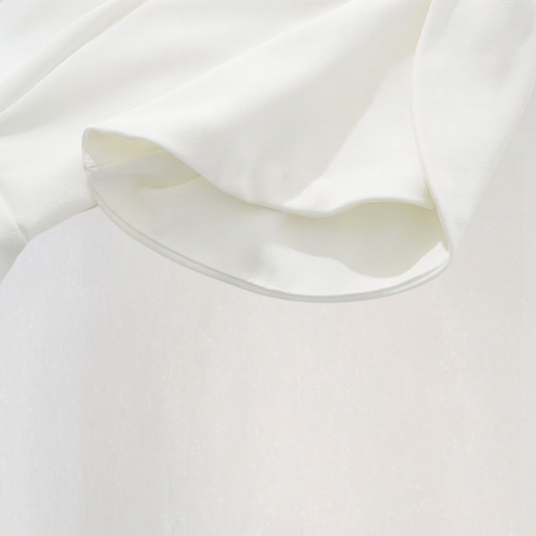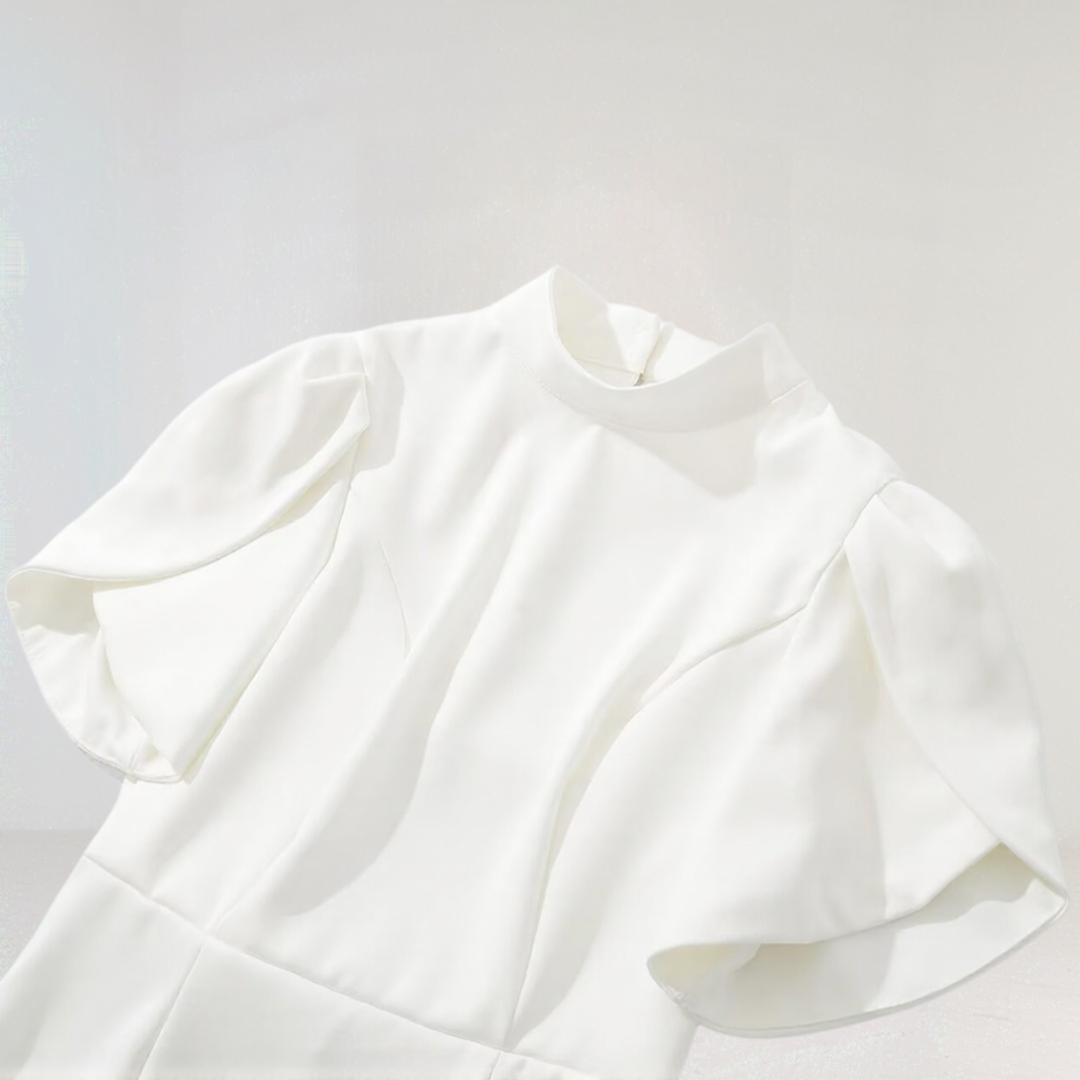 Questo abito mini presenta una silhouette che valorizza e maniche corte a palloncino. Il colletto alto strutturato aggiunge un tocco moderno e raffinato.