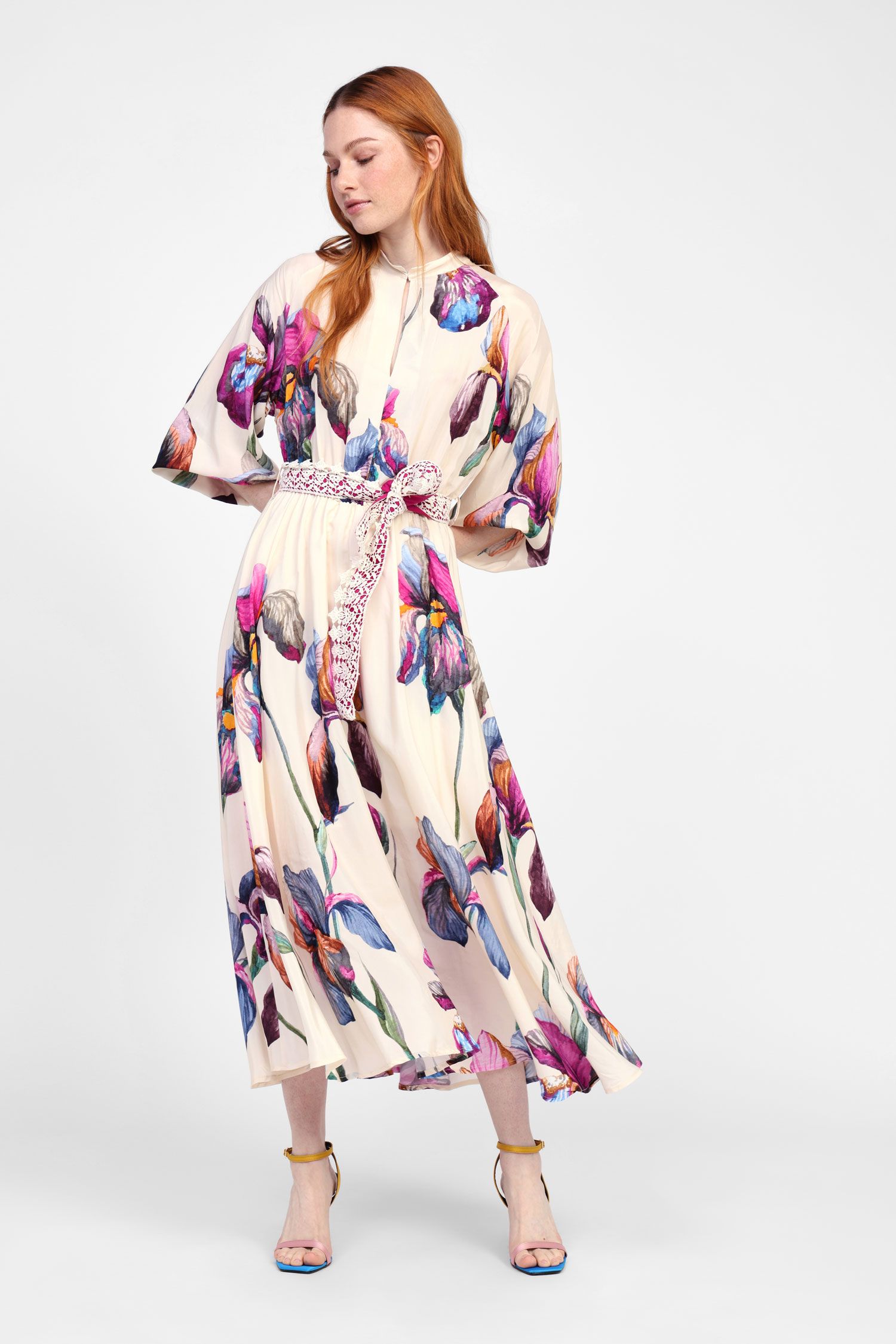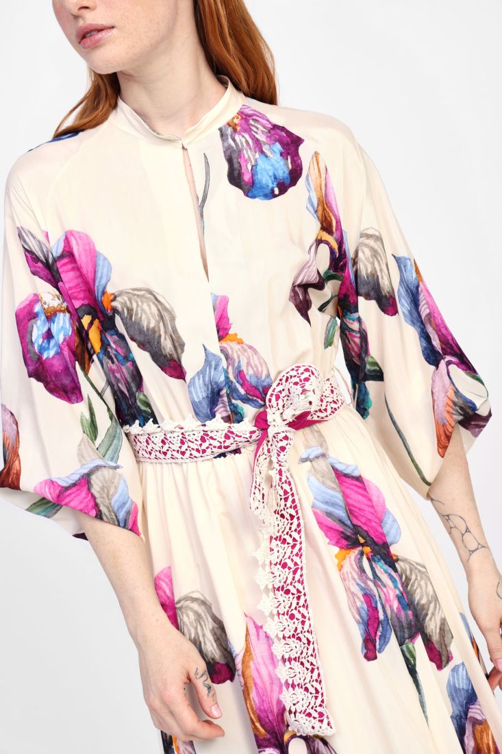 Questo abito lungo offre una silhouette fluida esaltata da una cintura in pizzo delicata. La sua stampa floreale aggiunge un tocco di freschezza e femminilità. Ideale per eventi, vacanze o una serata tra amici.